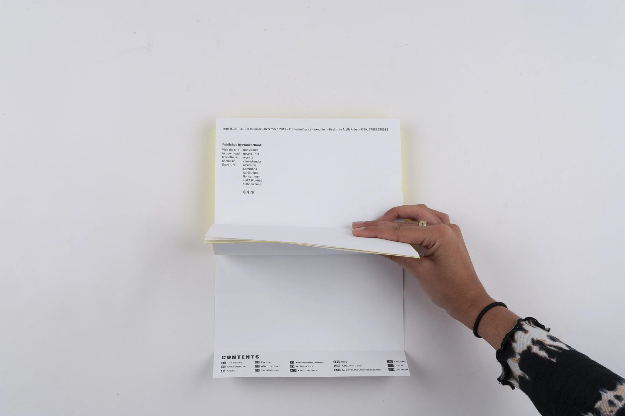 Mise en page du recueil de nouvelles « Dubliners », 1914, de l’auteur James Joyce. La mise en page du livre est pensée comme sa lecture, au fur et à mesure le lecteur découvre la ville de Dublin, comme les premières pages en transparences où la carte de la ville apparait.