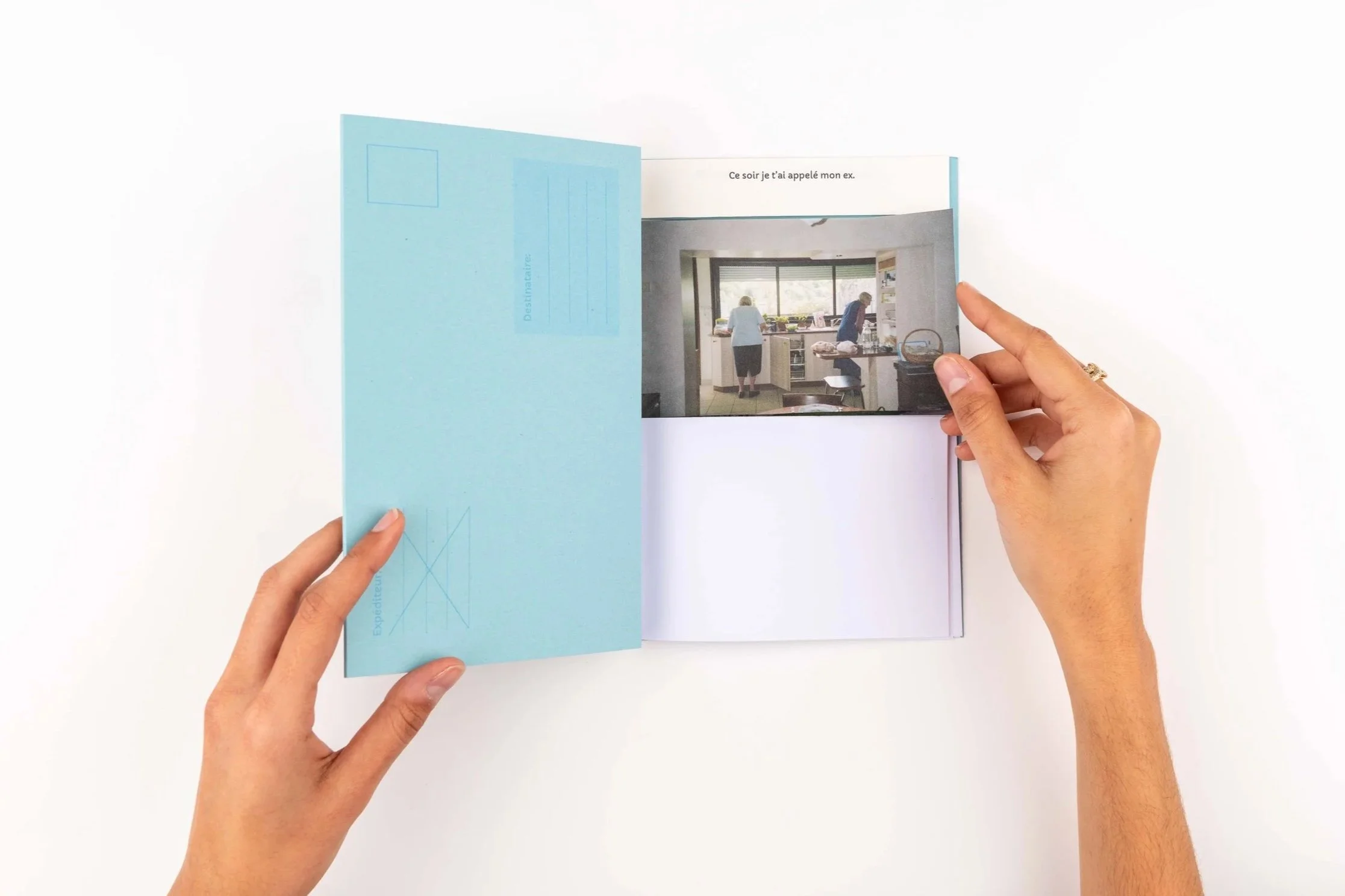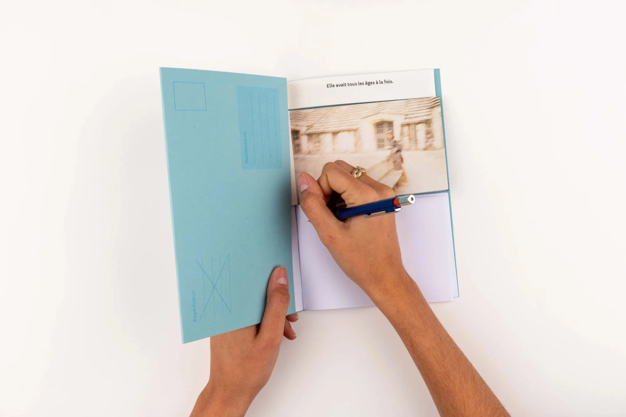 Cette exercice de création est motivée par le fait que l’utilisateur pense à une personne en particulier à qui il pourra envoyer, partager le carnet en ajoutant un timbre et l’adresse du destinataire.